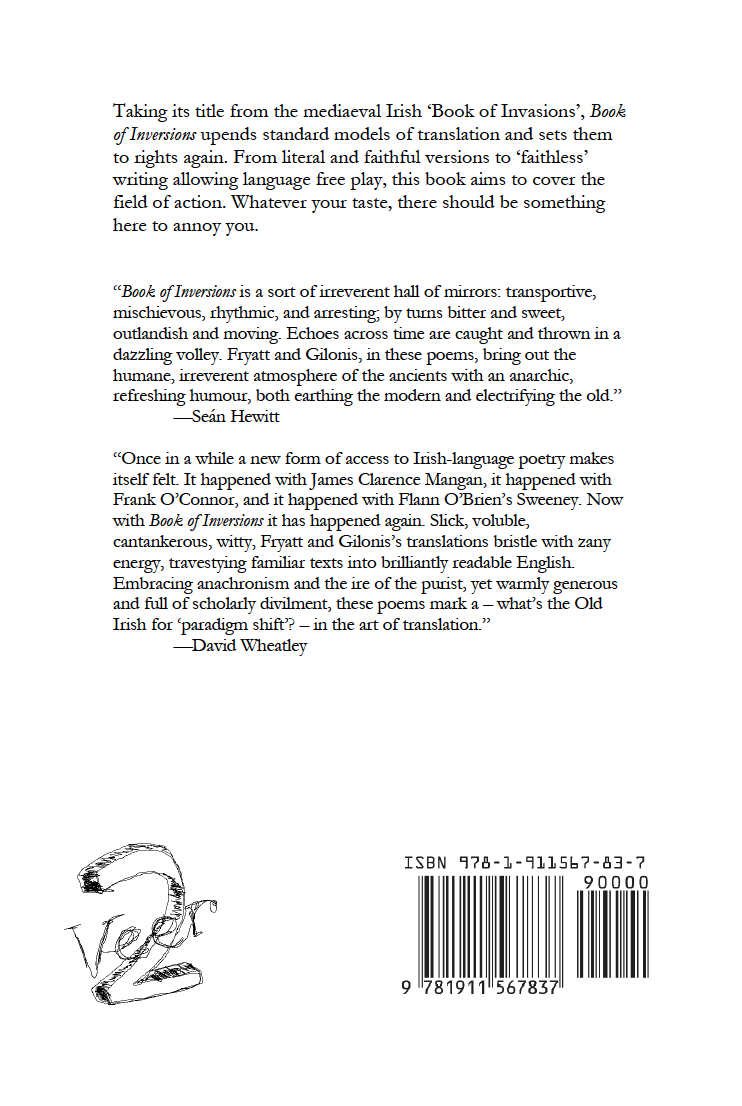 “Once in a while a new form of access to Irish-language poetry makes itself felt. It happened with James Clarence Mangan, it happened with Frank O’Connor, and it happened with Flann O’Brien’s Sweeney. Now with Book of Inversions it has happened again. Slick, voluble, cantankerous, witty, Fryatt and Gilonis’s translations bristle with zany energy, travestying familiar texts into brilliantly readable English. Embracing anachronism and the ire of the purist, yet warmly generous and full of scholarly divilment, these poems mark a – what’s the Old Irish for ‘paradigm shift’? – in the art of translation.”